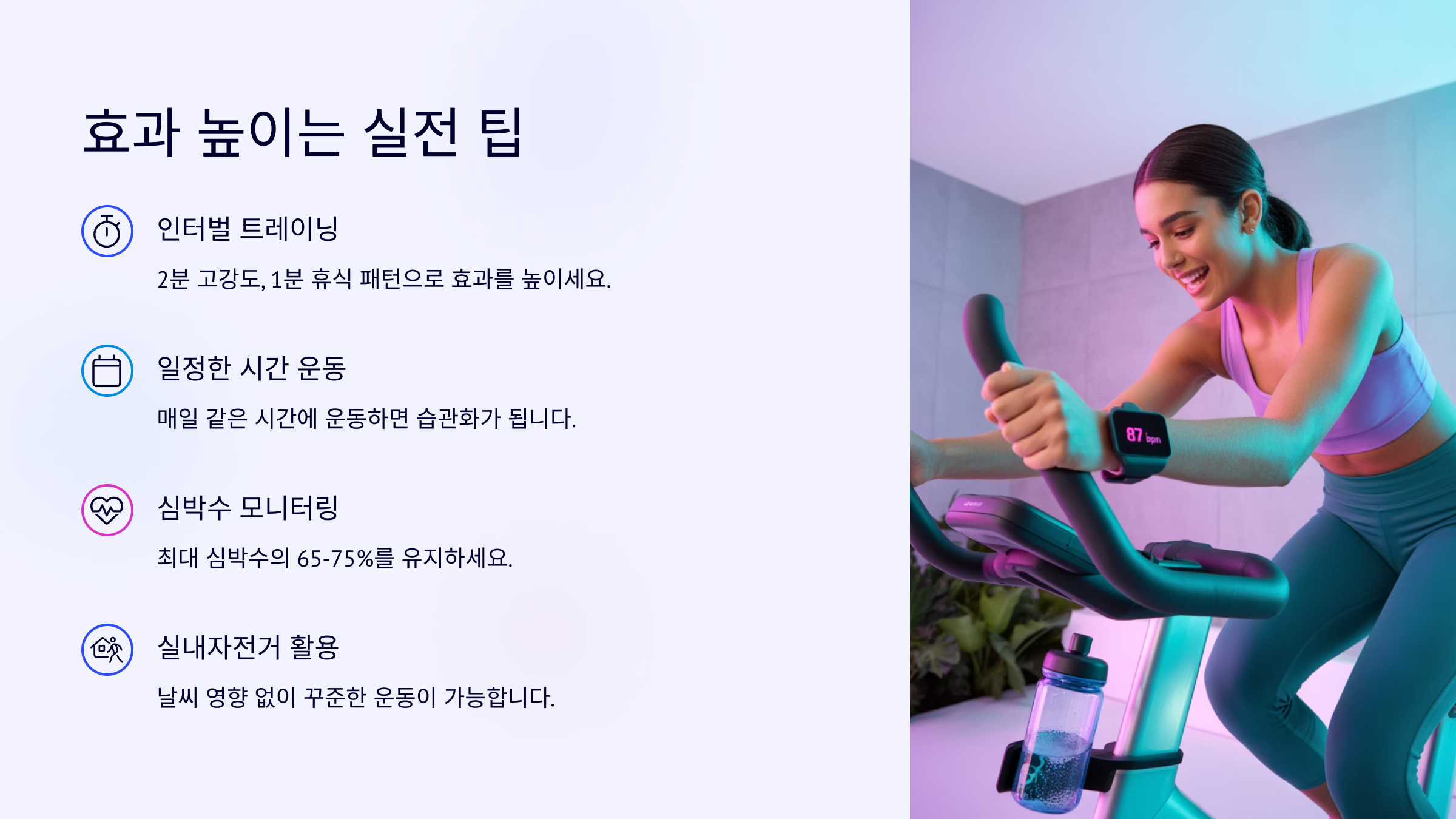 자전거 유산소 운동은 강도와 시간을 적절히 조절해야 체력 소모는 줄이고, 운동 효과는 극대화할 수 있어요. 초보자라면 너무 무리하지 않는 선에서 시작하는 게 가장 좋아요.