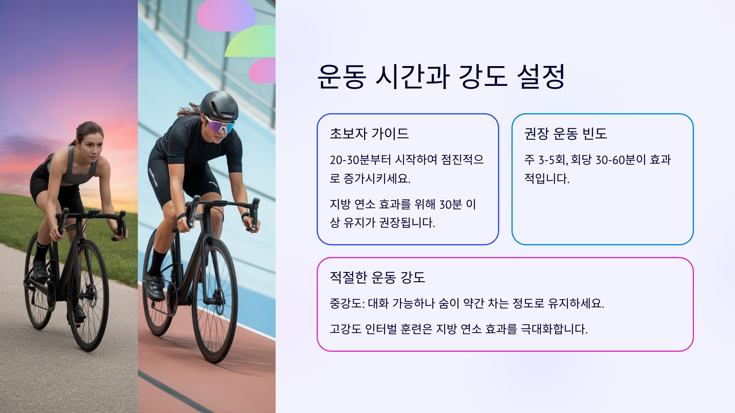 | 초보자 | 20~30분 | 지속적 저강도 페달링 | 낮음~중간 |