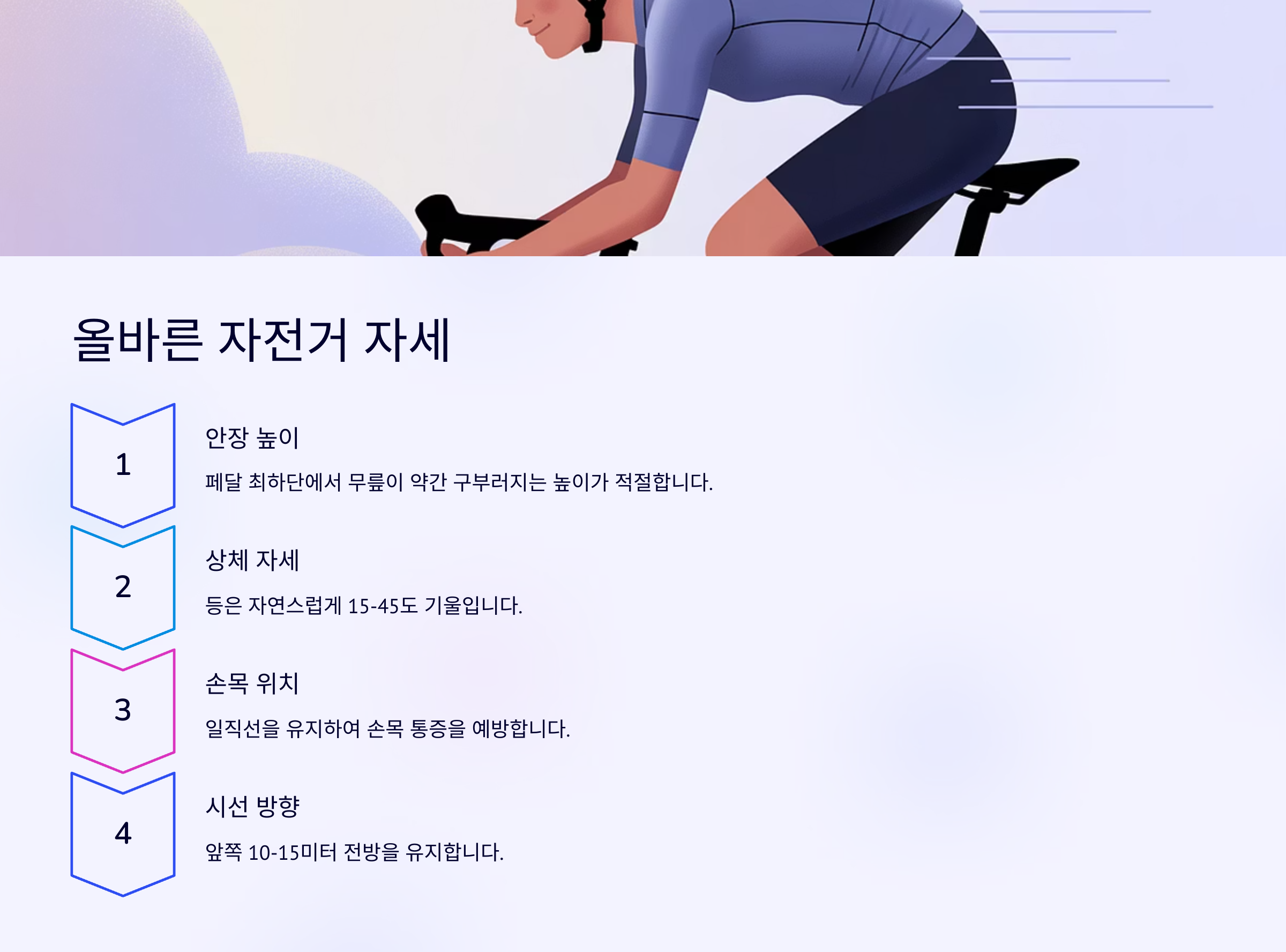 자전거는 자세만 잘 잡아도 운동 효과가 크게 높아지고, 반대로 잘못된 자세는 통증이나 부상을 유발할 수 있어요. 라이딩할 때는 상체와 하체의 균형을 잘 유지하는 것이 핵심이에요.
