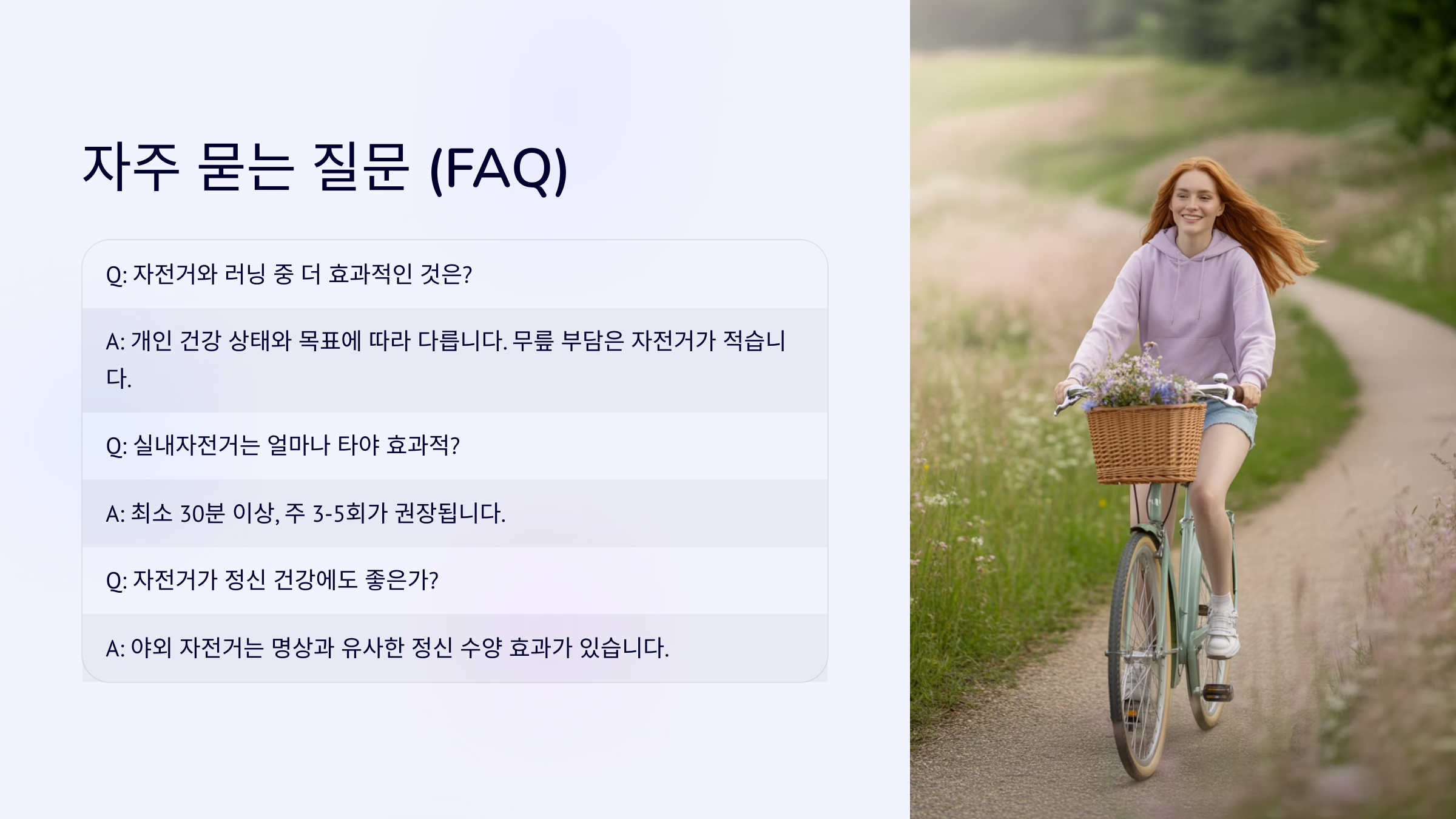 자전거 운동은 자신의 체력에 맞춰 조절하면서 꾸준히 지속하는 게 가장 중요해요. 페달을 밟는 시간보다 ‘계속하는 습관’이 진짜 결과를 만든답니다! 🚴♀️
