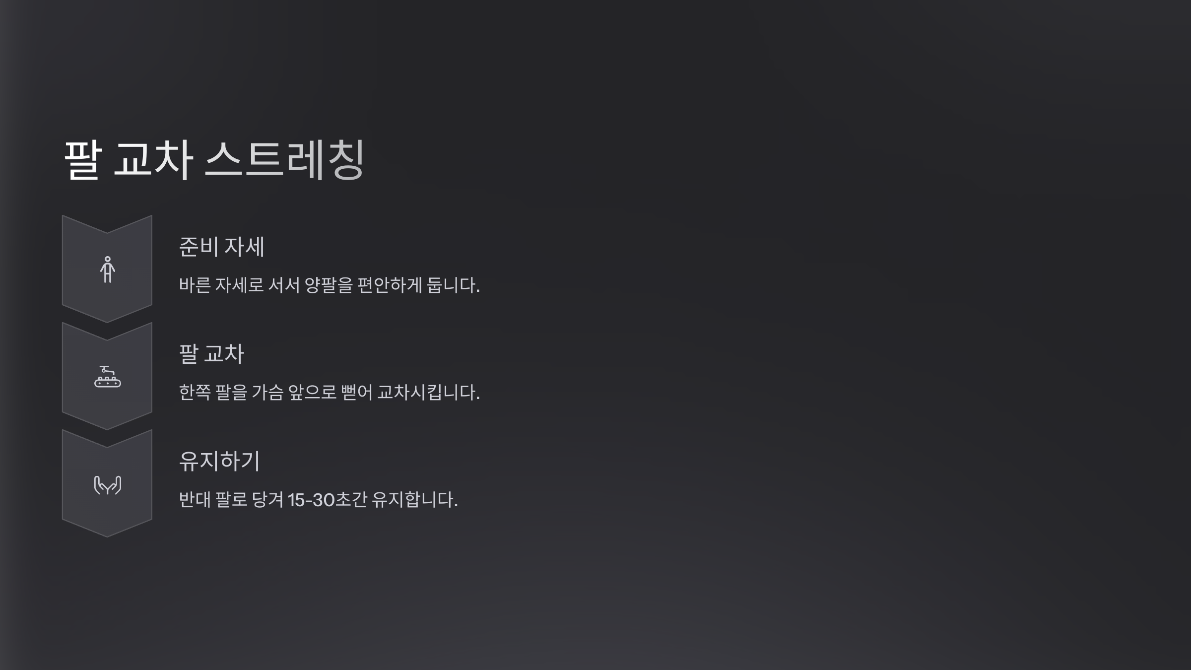 가장 기본적이지만 효과적인 어깨 스트레칭 동작이에요. 한쪽 팔을 가슴 쪽으로 가져오고, 반대쪽 팔로 그 팔꿈치를 감싸면서 몸 쪽으로 당겨주세요. 이때 어깨가 올라가지 않도록 주의하면서 20초 정도 유지해요.