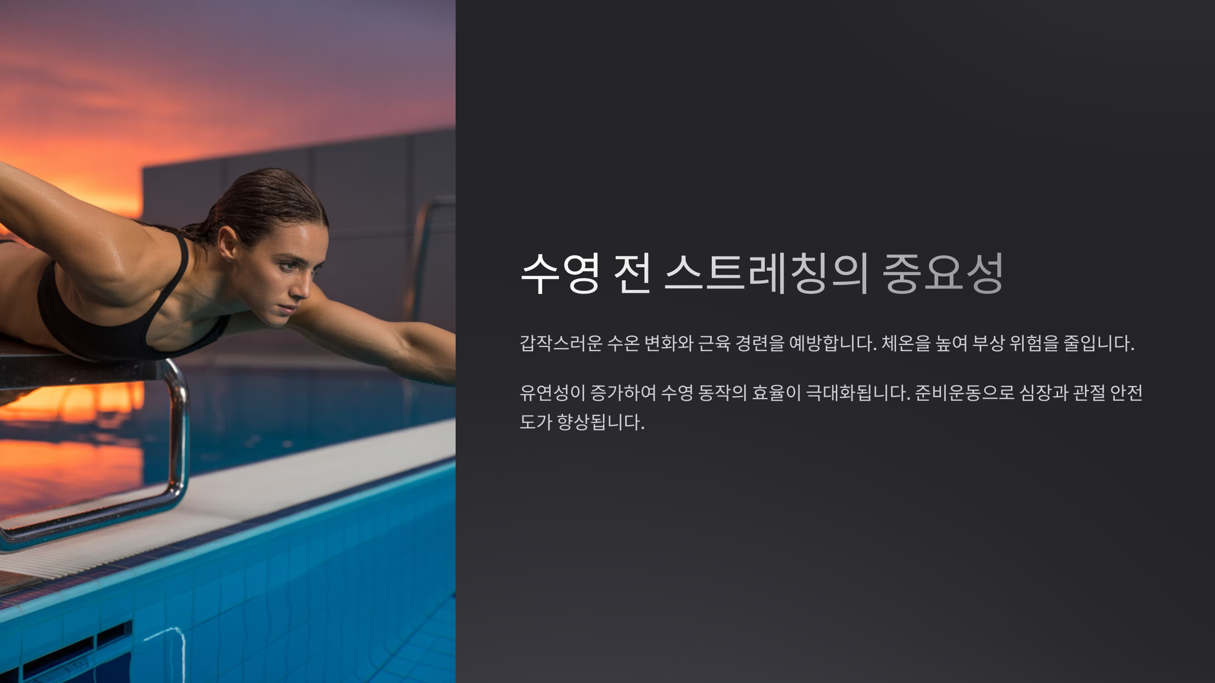 이 다섯 가지 스트레칭을 수영 전에 루틴처럼 하면 부상을 예방하고, 몸의 컨디션도 훨씬 좋아질 거예요. 짧은 시간 투자로 더 건강한 수영을 즐겨보세요! 😊