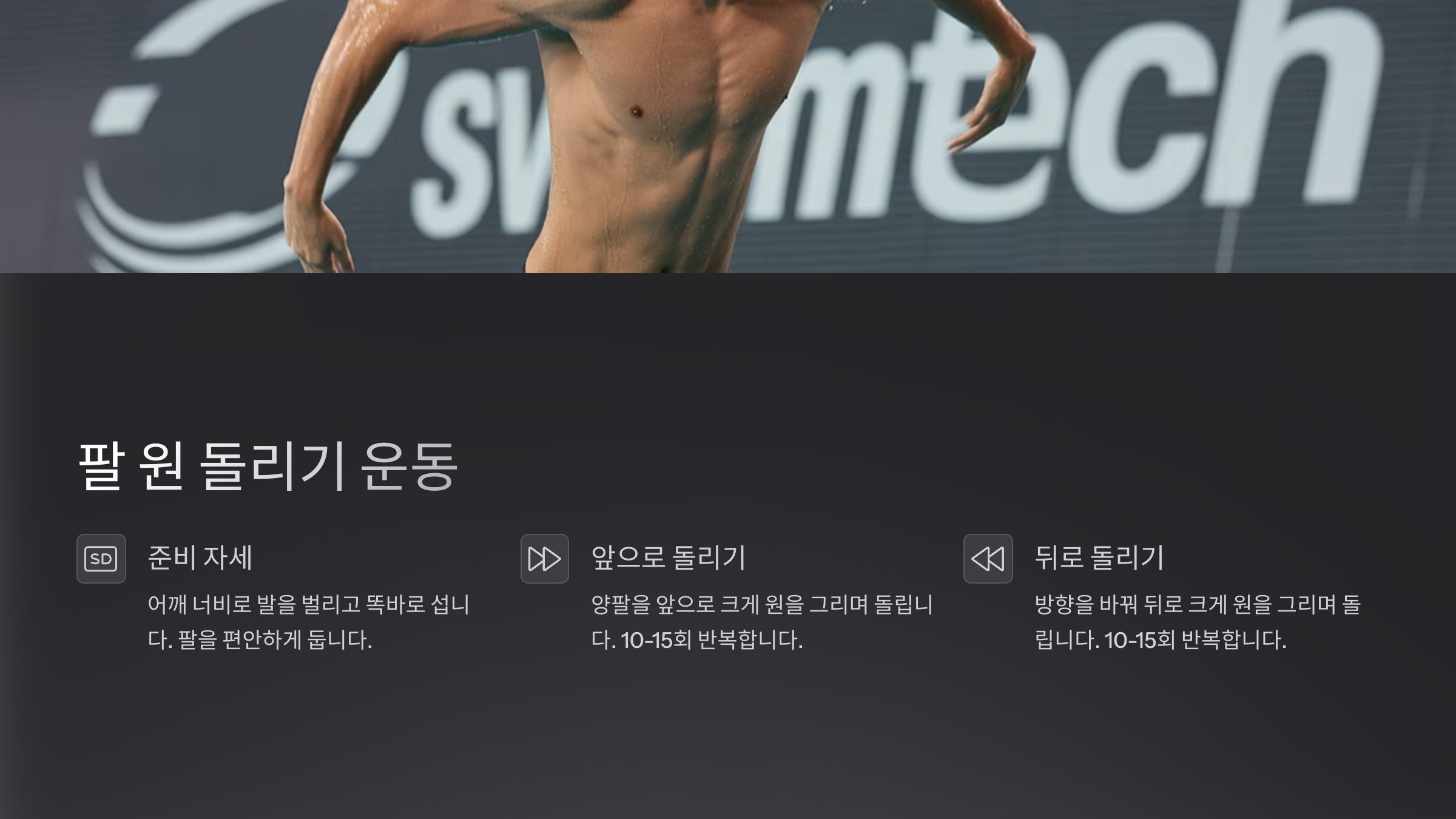 시계 방향 10회, 반대 방향 10회를 반복하면서 점점 원의 크기를 키우면 어깨가 풀리는 느낌이 확 와요. 이 동작은 정적인 스트레칭과 다르게 동적 워밍업이기 때문에, 실제 수영 동작과도 잘 연결돼요.
