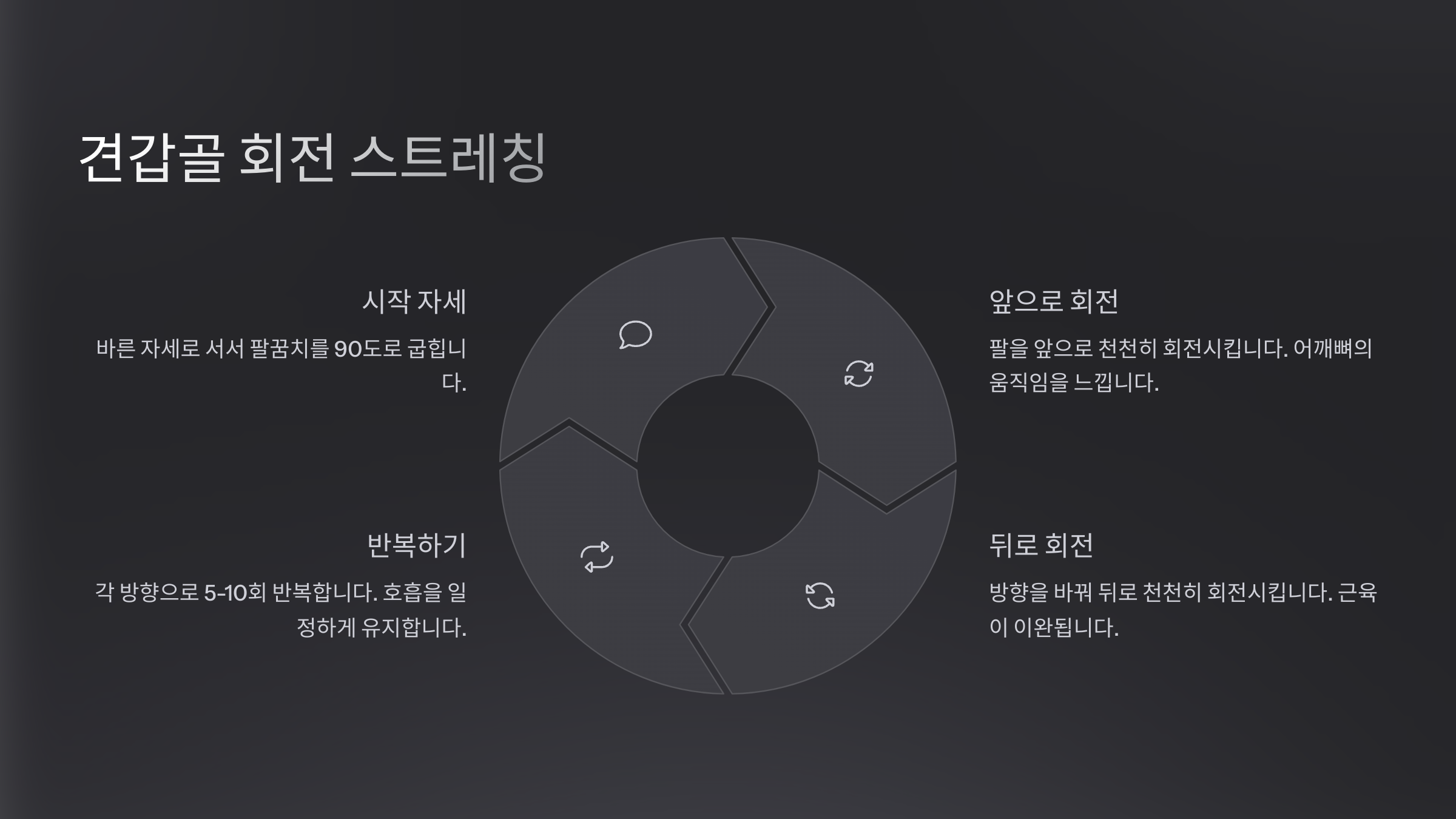 A3. 각 동작당 20~30초씩 2~3회 반복하면 충분해요. 전체적으로 5분 정도만 투자해도 어깨가 훨씬 부드러워져요.