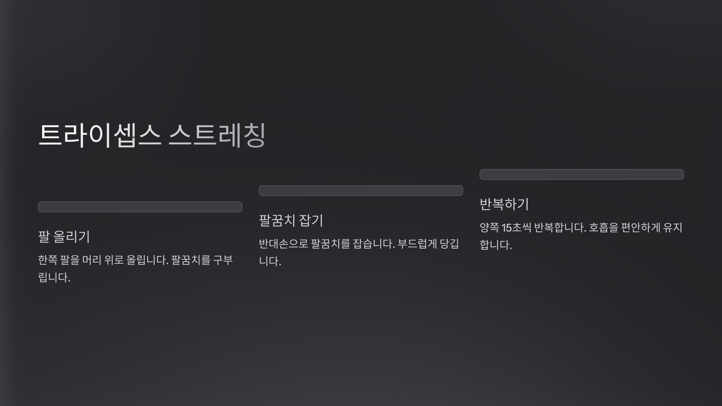 | 트라이셉스 스트레칭 | 팔 뒤쪽, 견갑골 | 상완근 이완 |